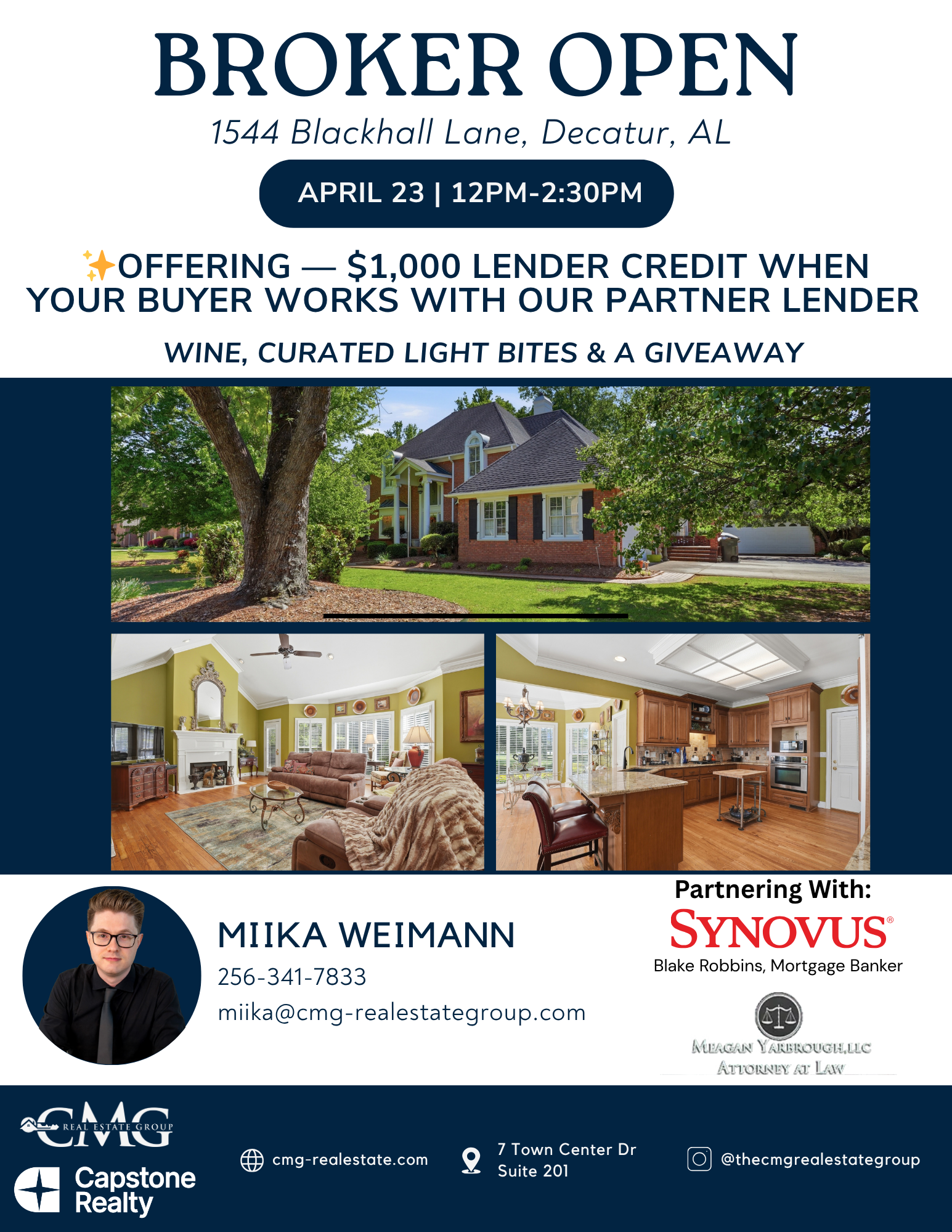You are invited to a Hartselle Brokers Open. Attend all 4 locations to enter for a $200 Grand Prize. 700 Ronnie Drive SE - Taylor Seiver & Gabrielle Bili 1906 Rae Court - Kenyala Hicks 303 Wheeler Street NW - Jade Chowning 121 Sherrill Street - Gabrielle Bili
